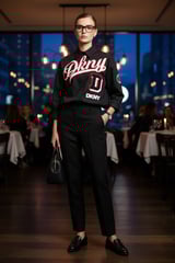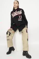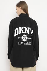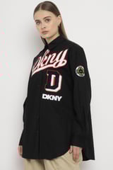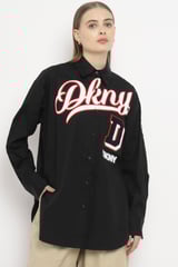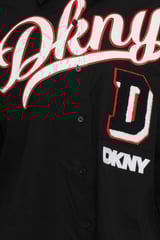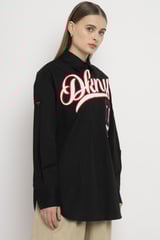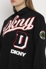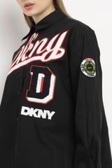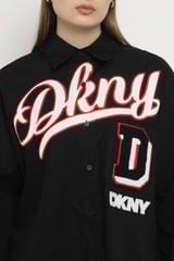 Black Oversized Button-Up Shirt with Varsity Logo Appliqué