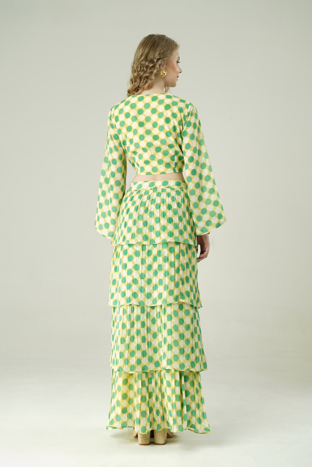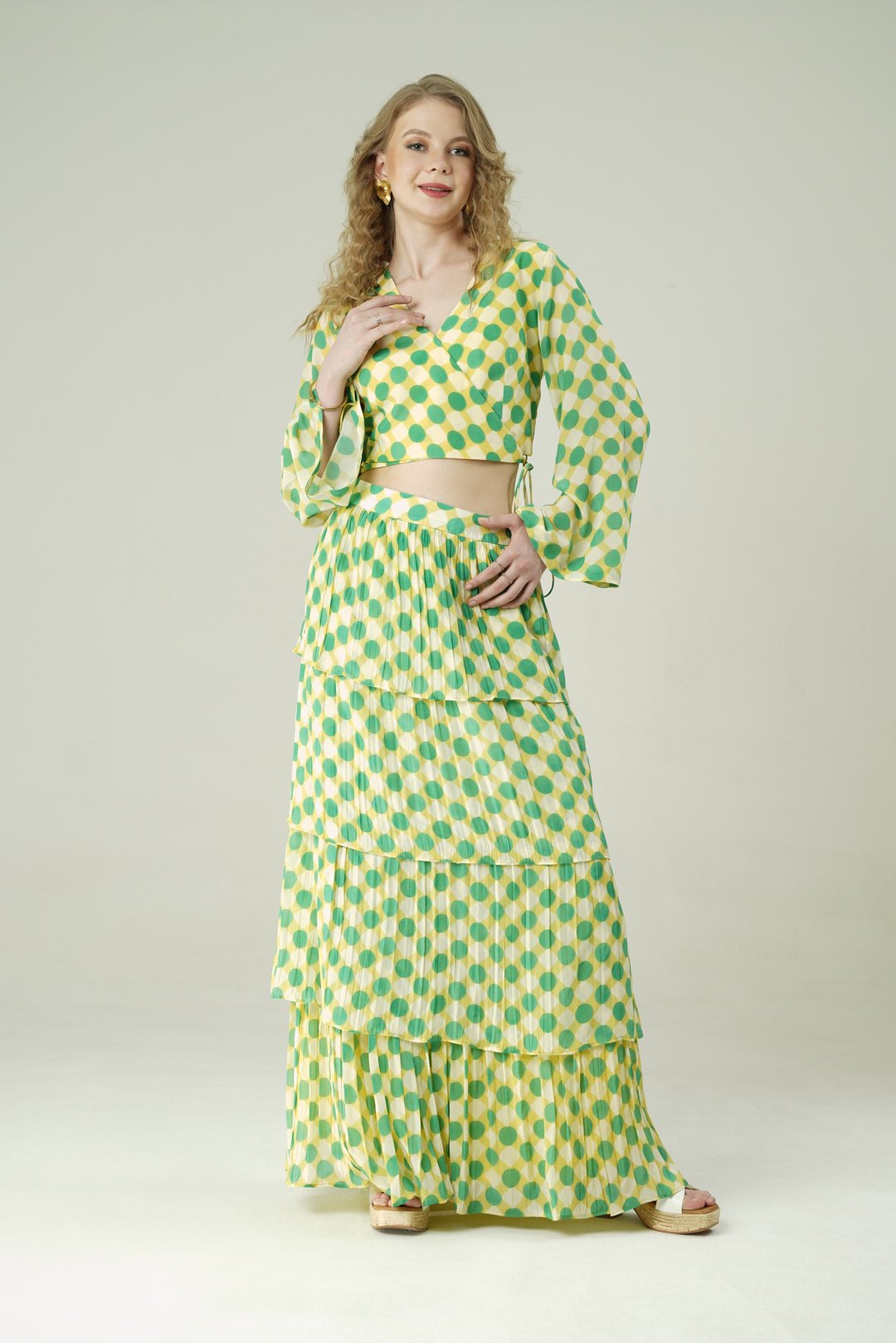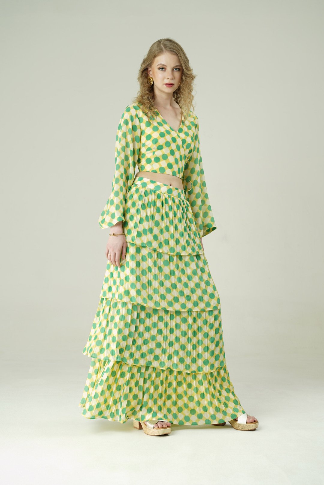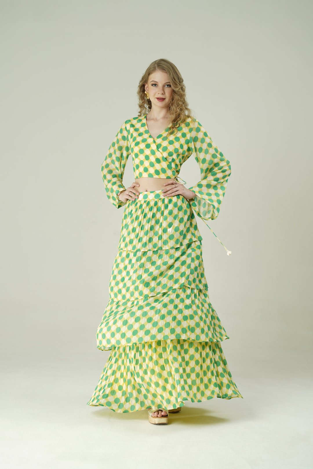 Lime Bloom Polka Wrap Crop Top And Tiered Skirt Co-Ord Set