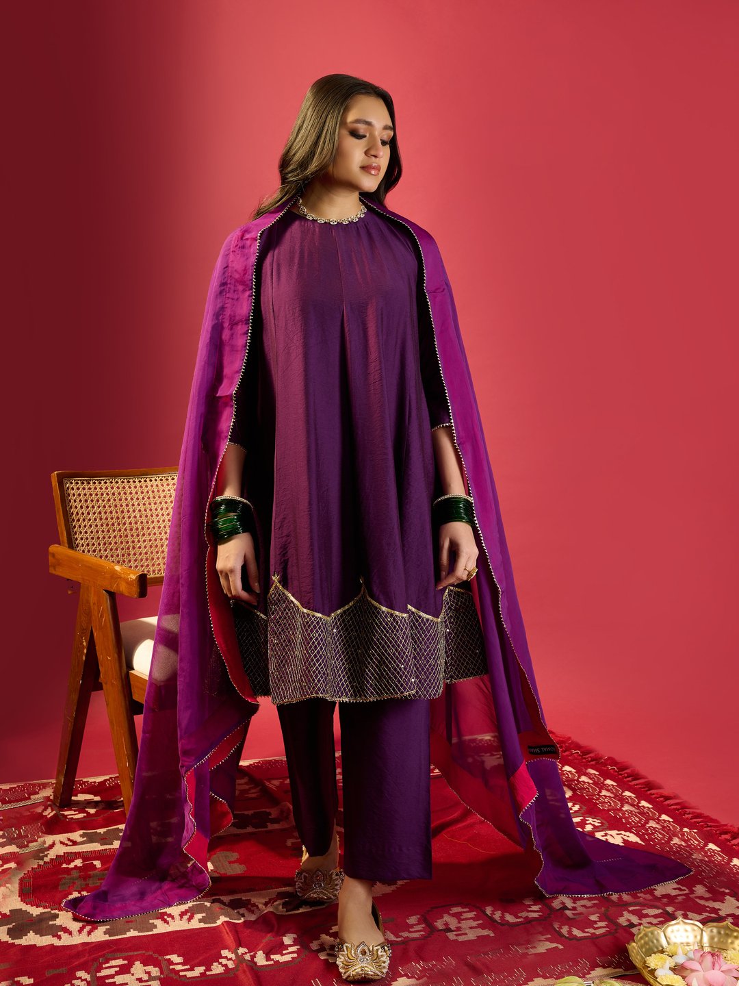 Purple Shoulder Kali Kurta with Pant and Dupatta