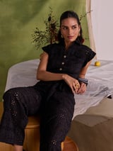 Black Cotton Schiffli Cutwork Button-Down Jumpsuit