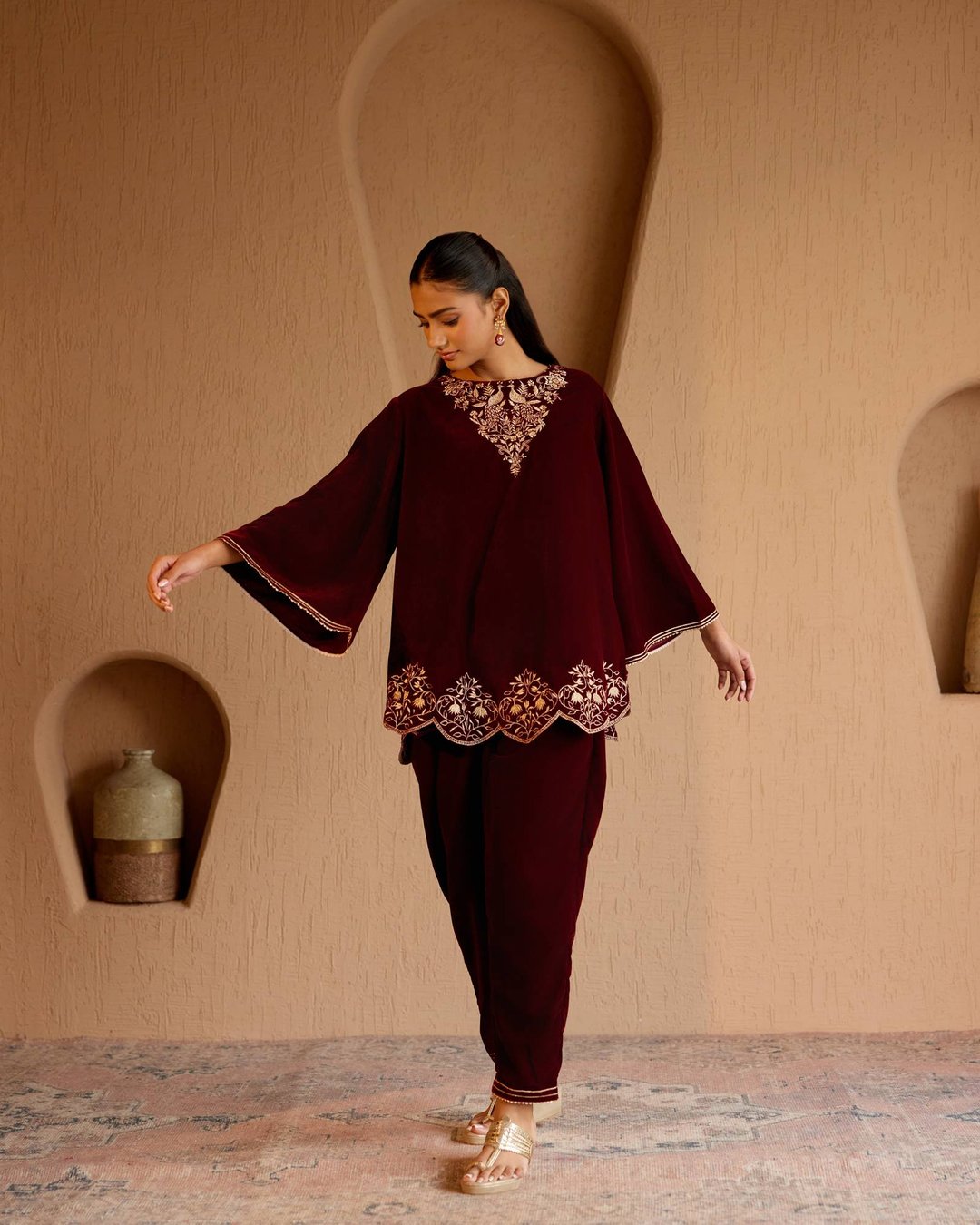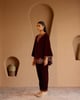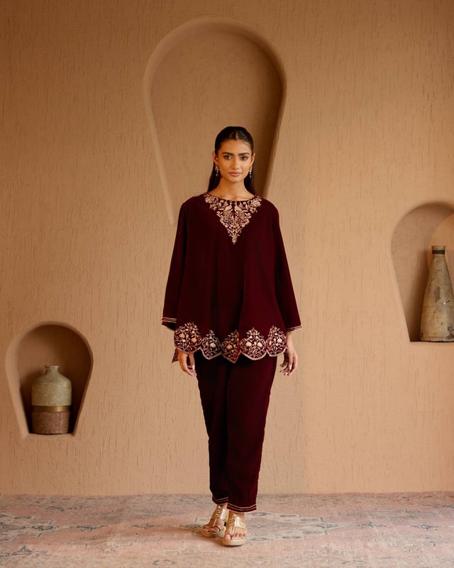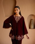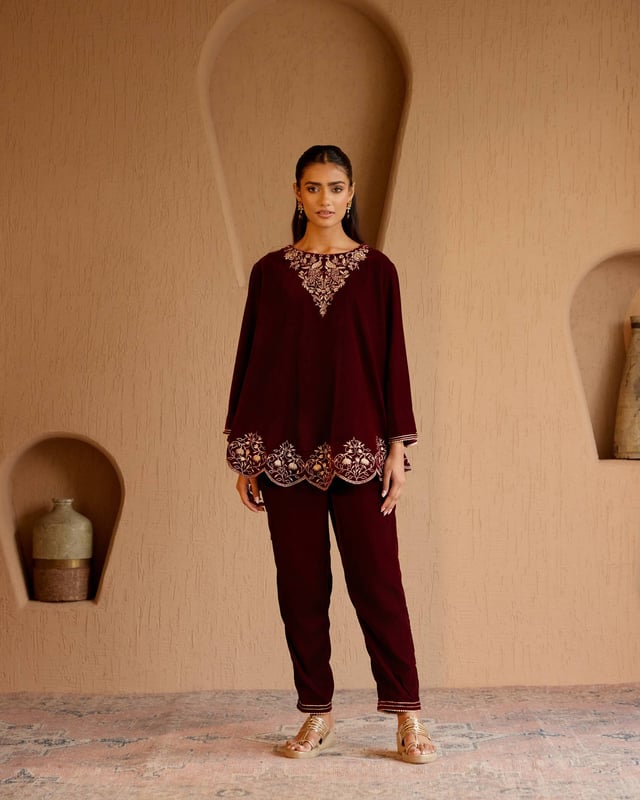 Maroon Peacock Velvet Short Kurta With Straight Pants - Set of 2