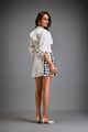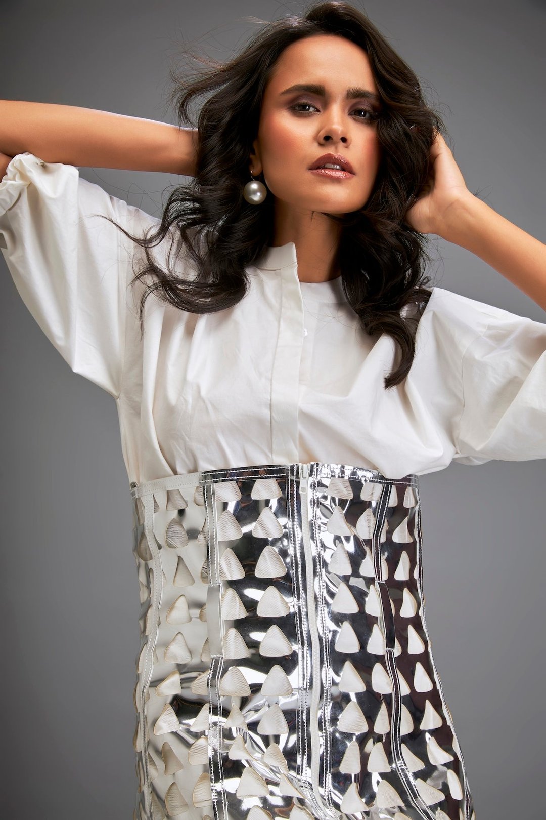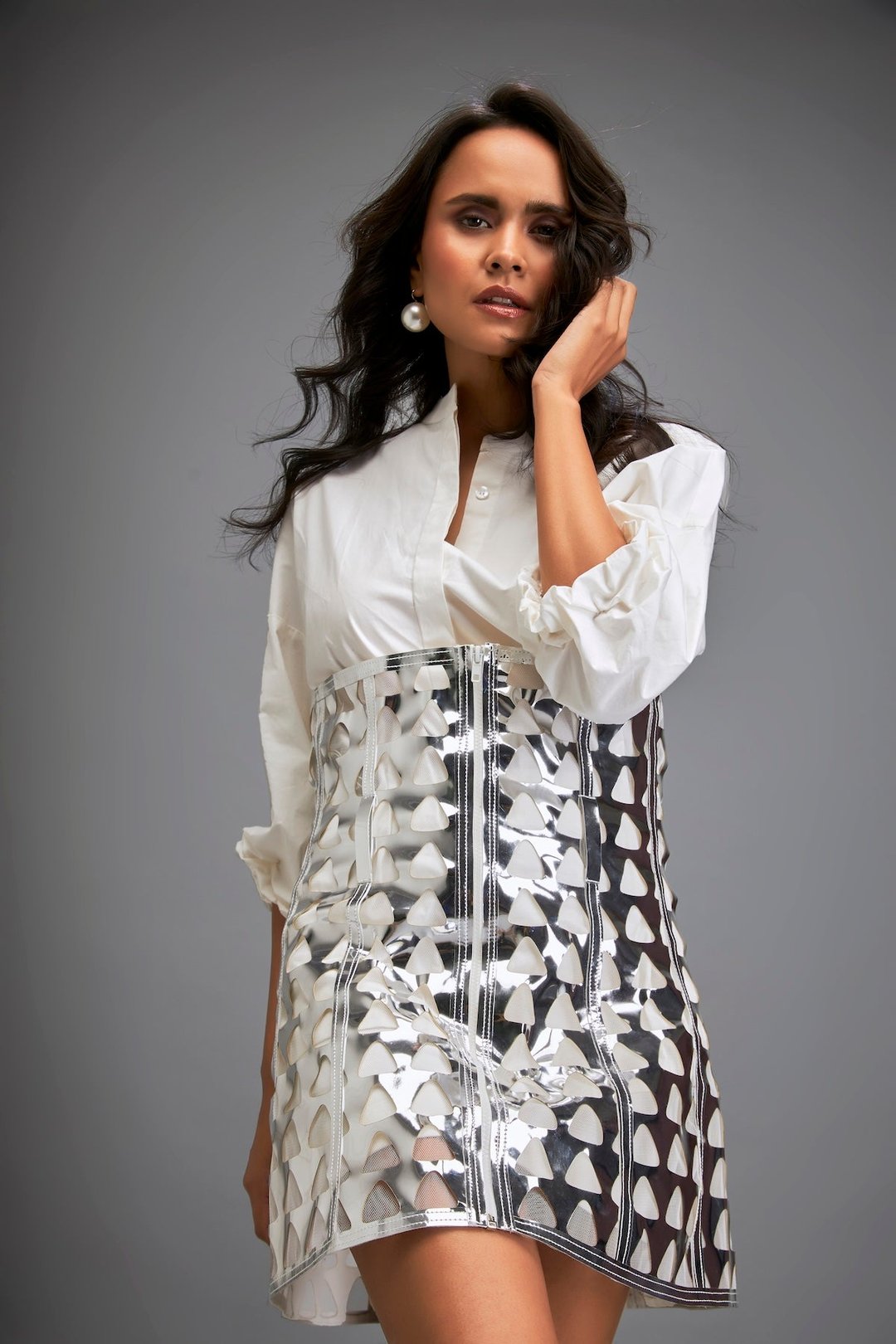 Shirt Paired with a Metallic Mini Skirt