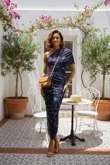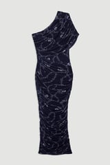 Blue One-Shoulder Ruched Mesh Midi Dress