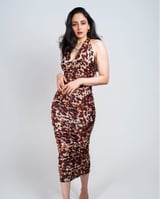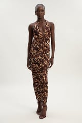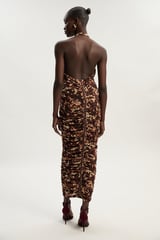 Multicolor Leopard Print Halter Neck Ruched Mesh Midi Dress