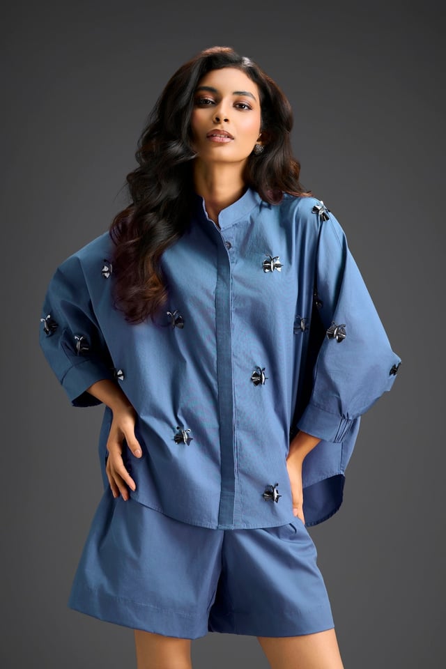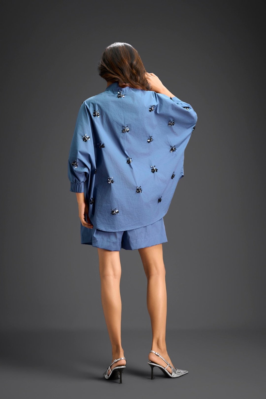 Blue Butterfly Embellished Pleated Shirt & Shorts Set