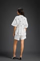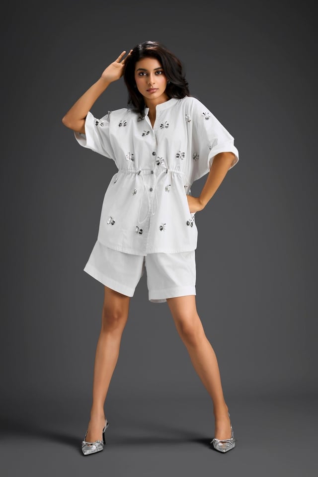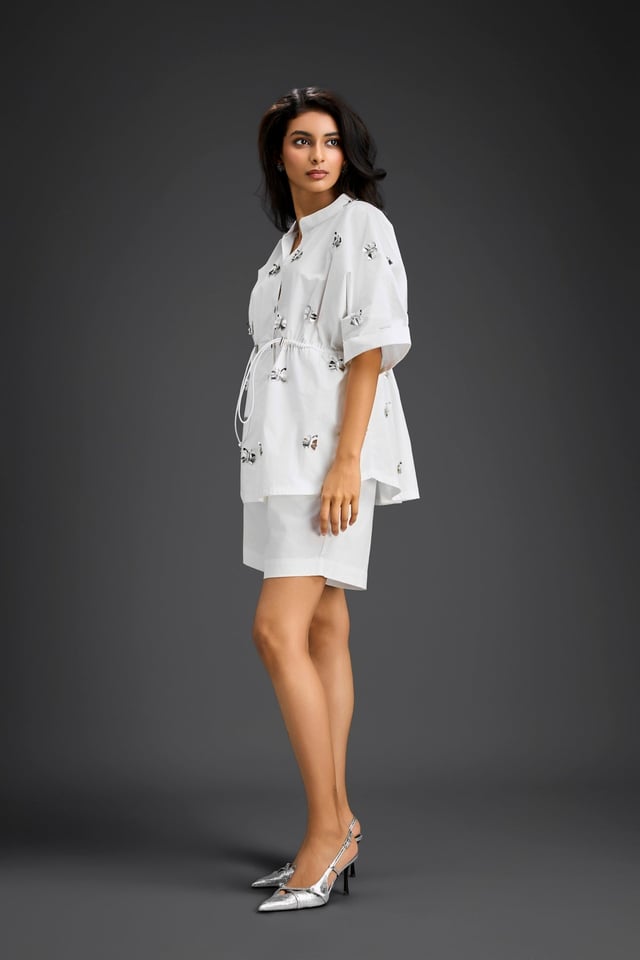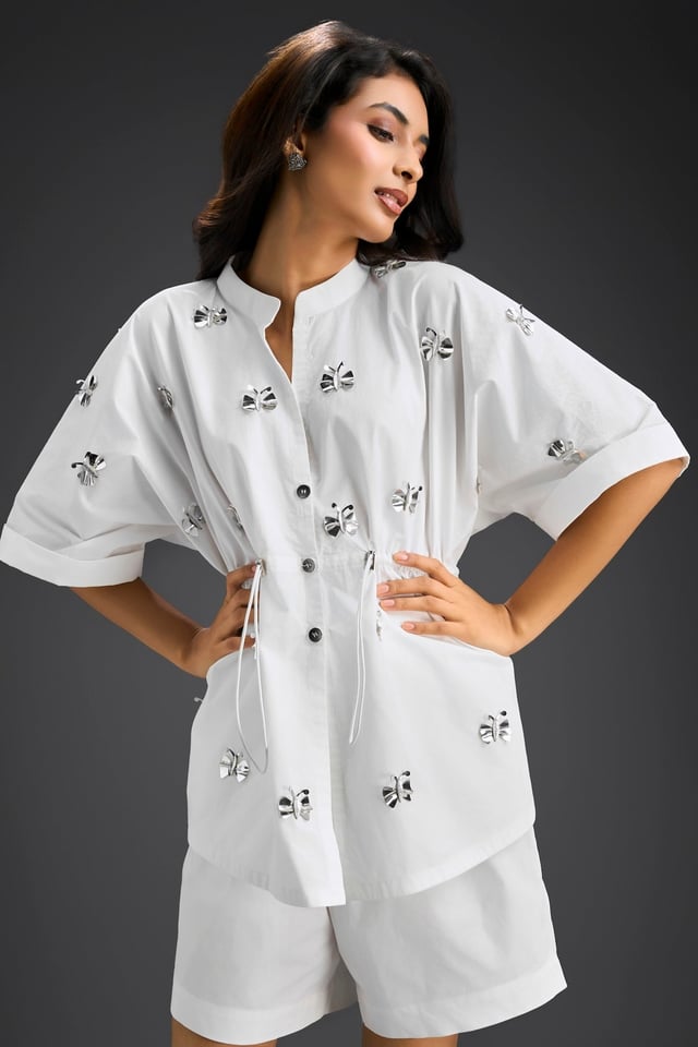 White Butterfly Embellished Drawstring Shirt & Shorts Set