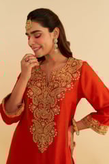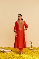 Burnt Orange Upada Silk Embroidered Kurta Set