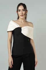Black and Ivory Colorblock Asymmetric Off-Shoulder Top