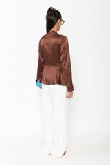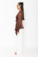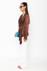 Brown Crushed Satin Wrap-Front Peplum Top