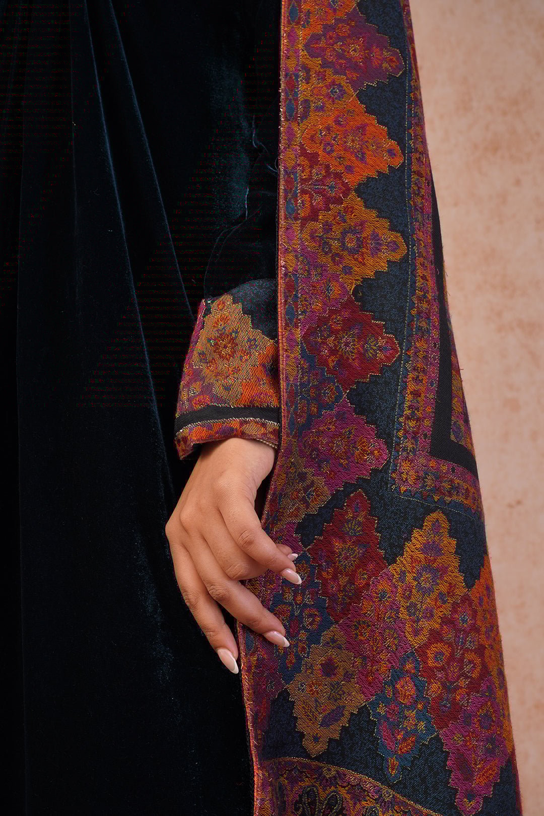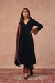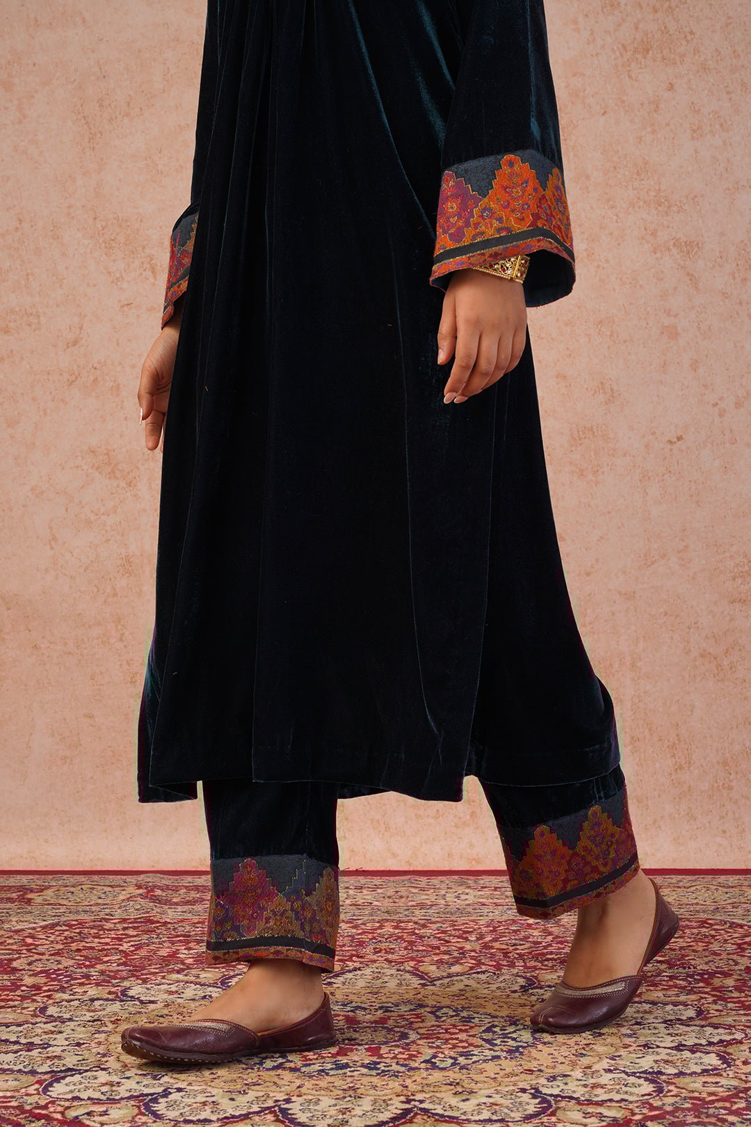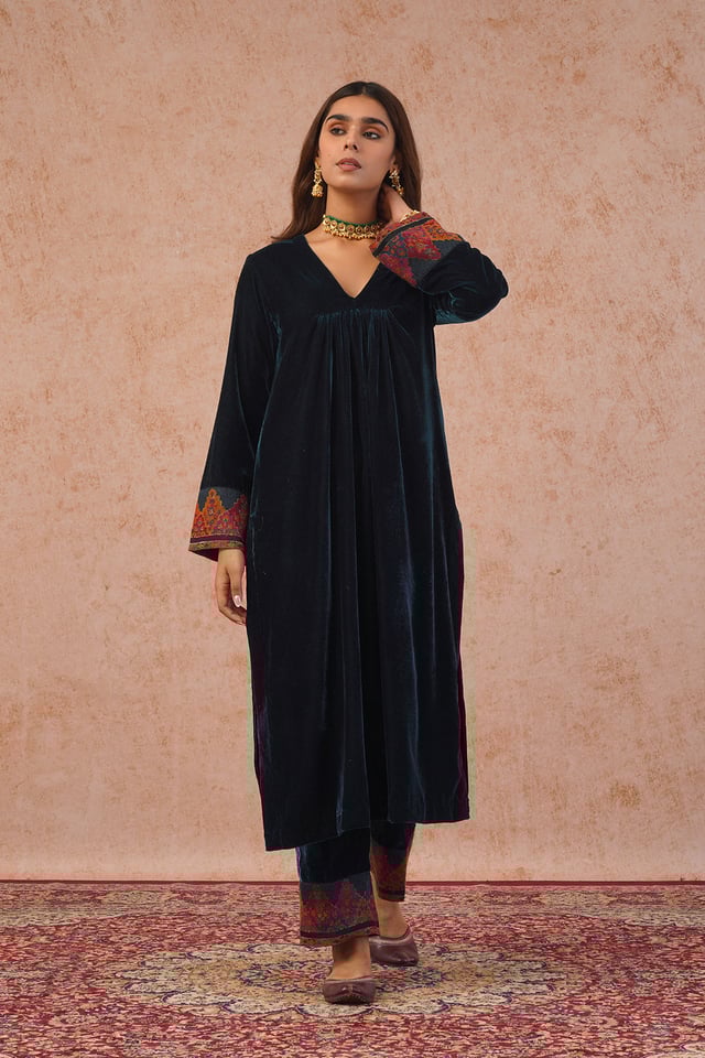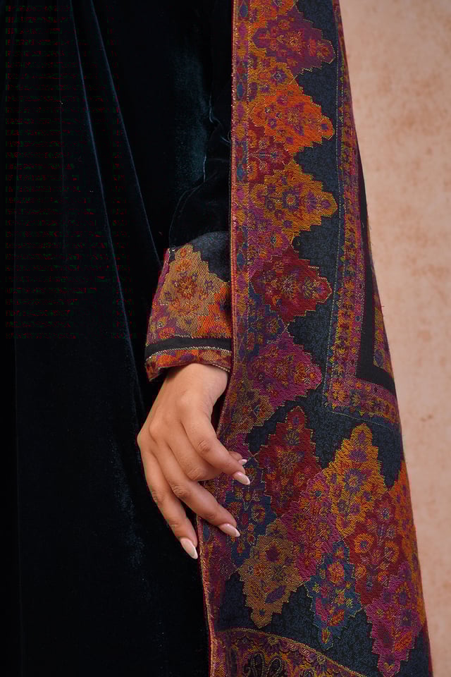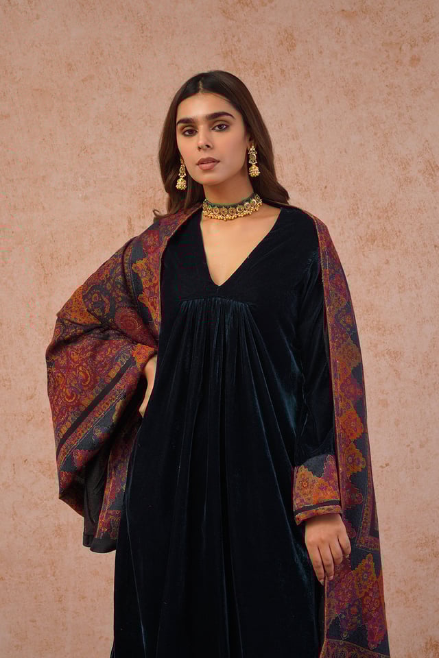 Teal Blue Velvet Suit with Woven Dupatta