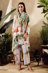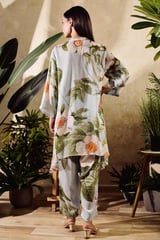 Cupro Satin Print Floral V Collar Daisy Bloom Tunic And Pant Set