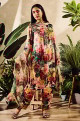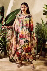 Cupro Satin Print Floral Round Watercolor Garden Kurta And Pant Set