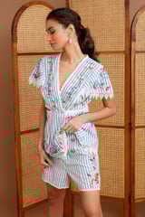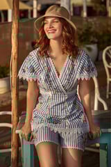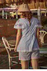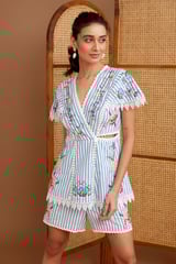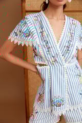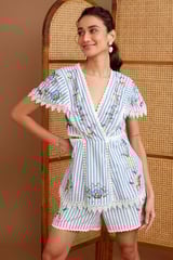 Blue Striped Cotton Embroidered Lace-Trim Shorts