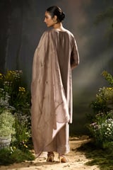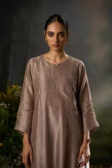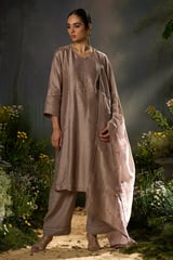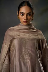 Beige Raw Silk A-Line Embroidered Kurta Set With Dupatta