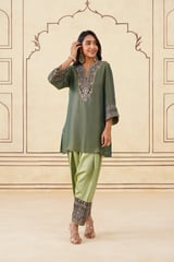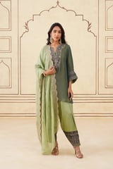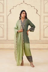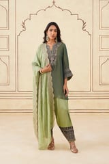 Green Crush Tissue Embroidered Kurta Set with Organza Dupatta