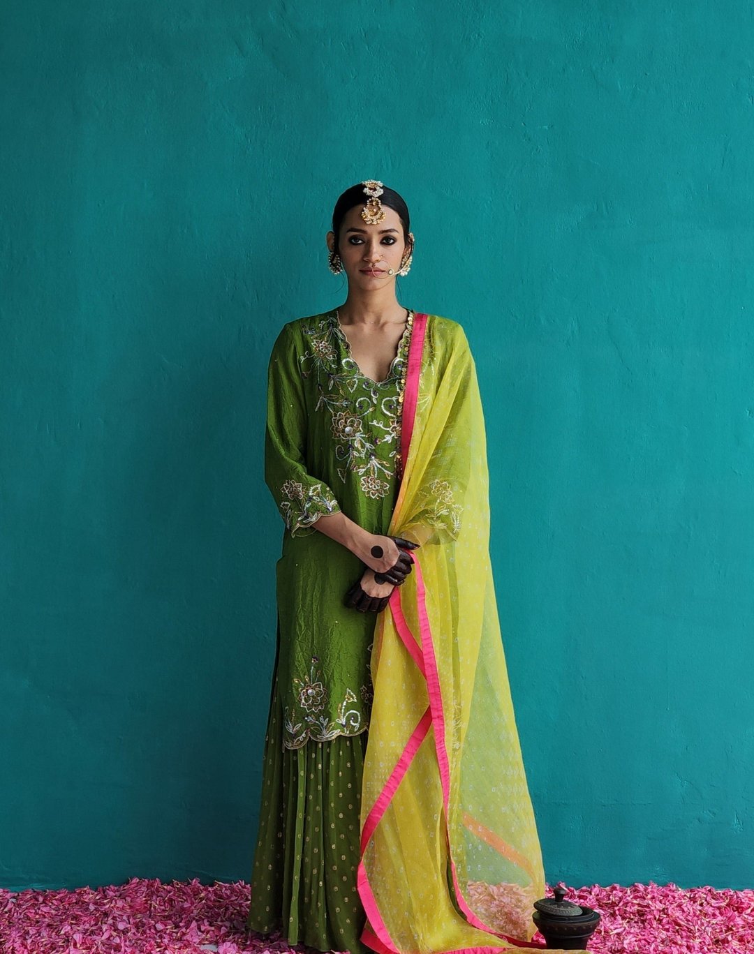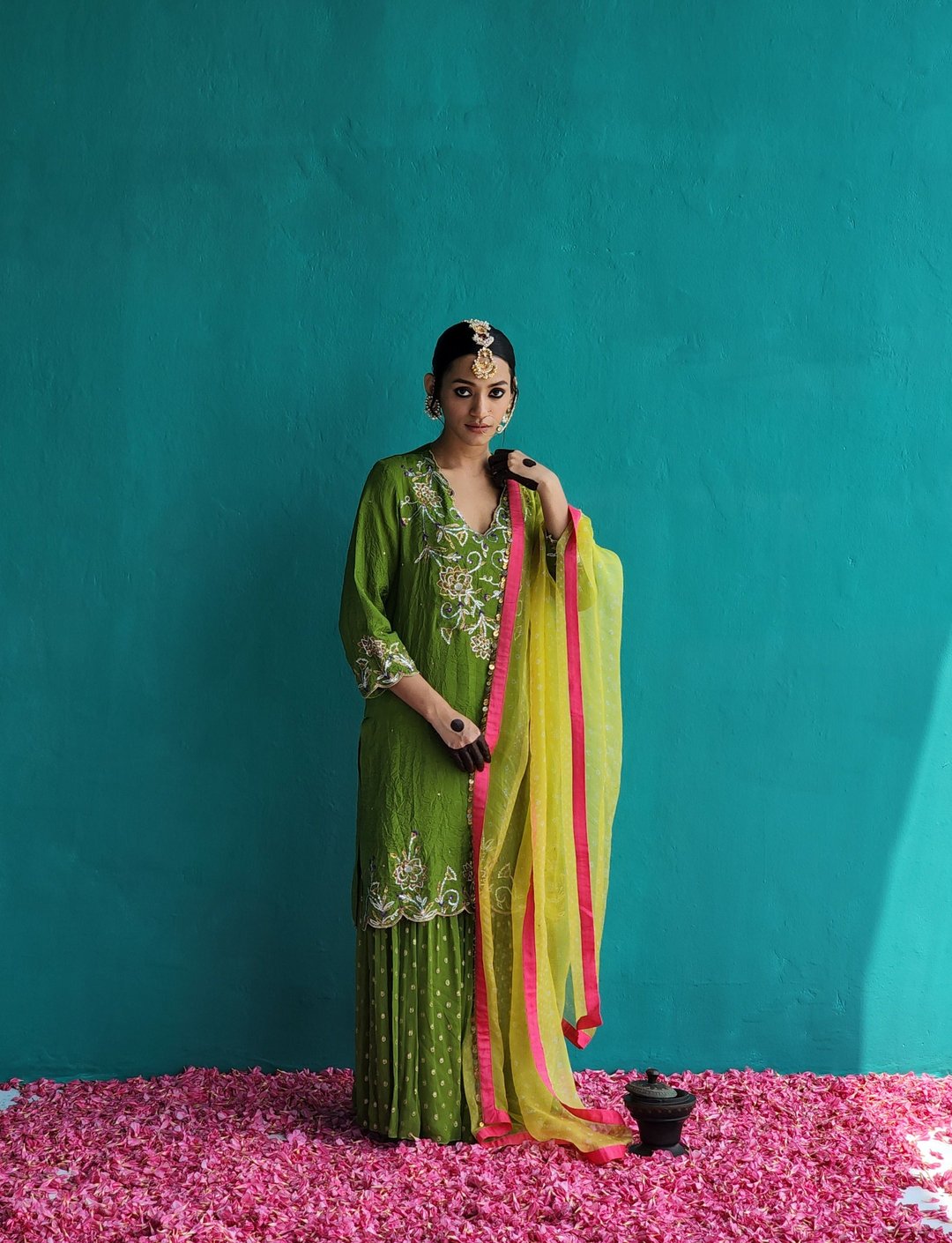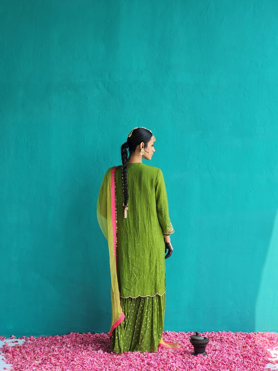 Mehendi Green Crush Silk Kurta with Sharara & Dupatta