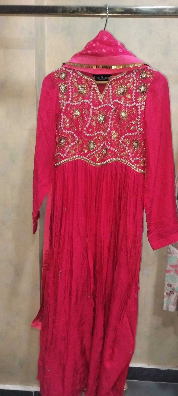 Magenta Crush Silk Kurta with Yoke Embroidery, Tissue Pant and Bandhej Print Organza Dupatta