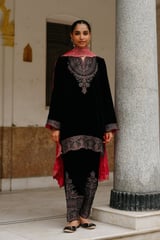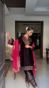 Black Velvet Embroidered Kurta Set with Pink Dupatta