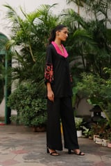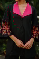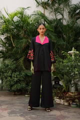 Black Embroidered Co-ord Set with Hot Pink Collar