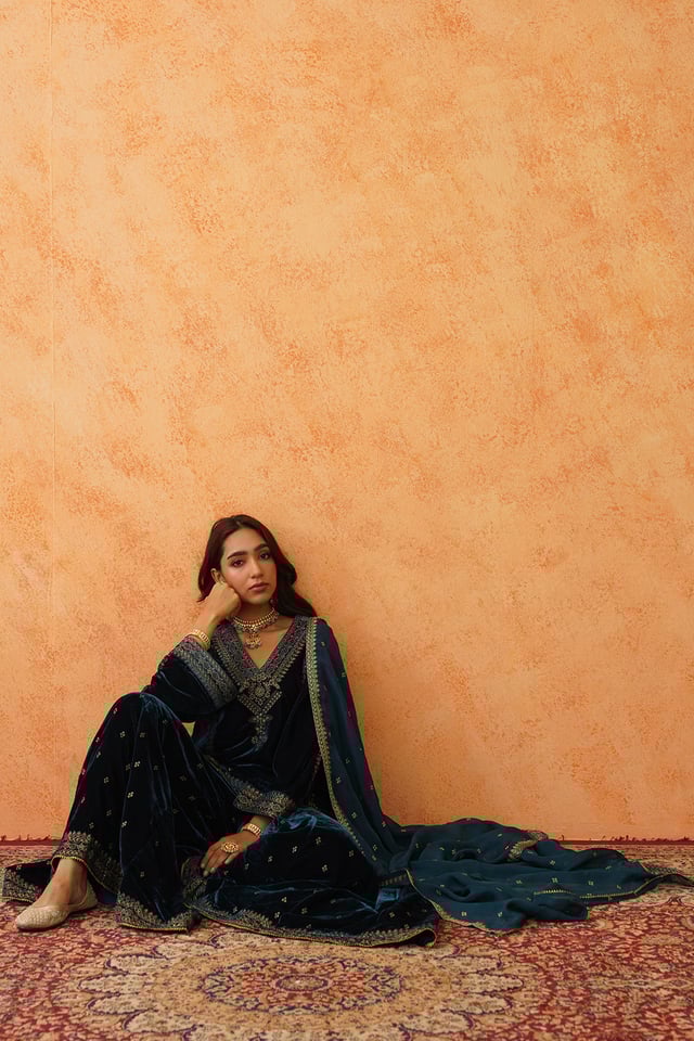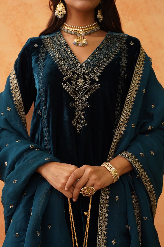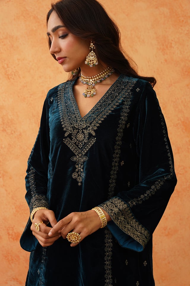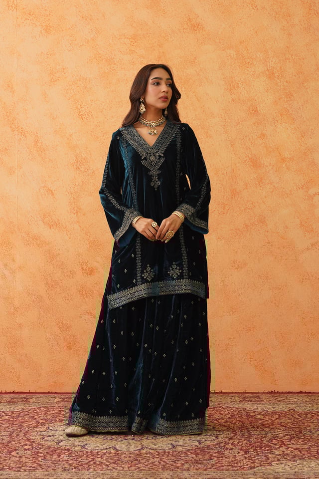 Teal Blue Velvet Embroidered Sharara Set
