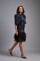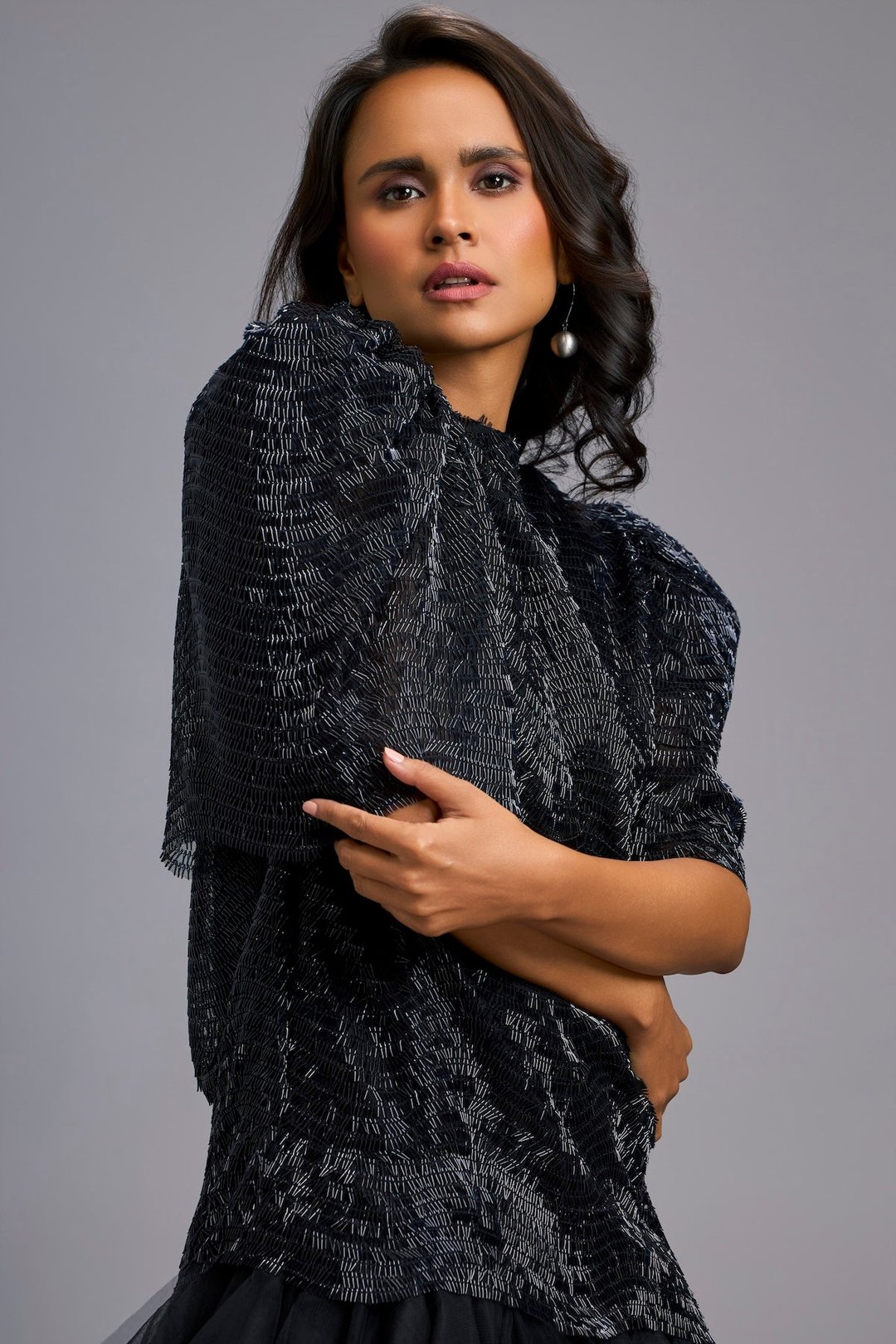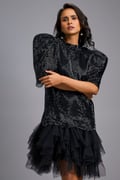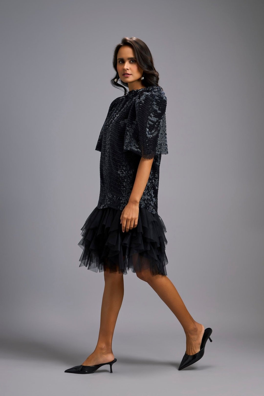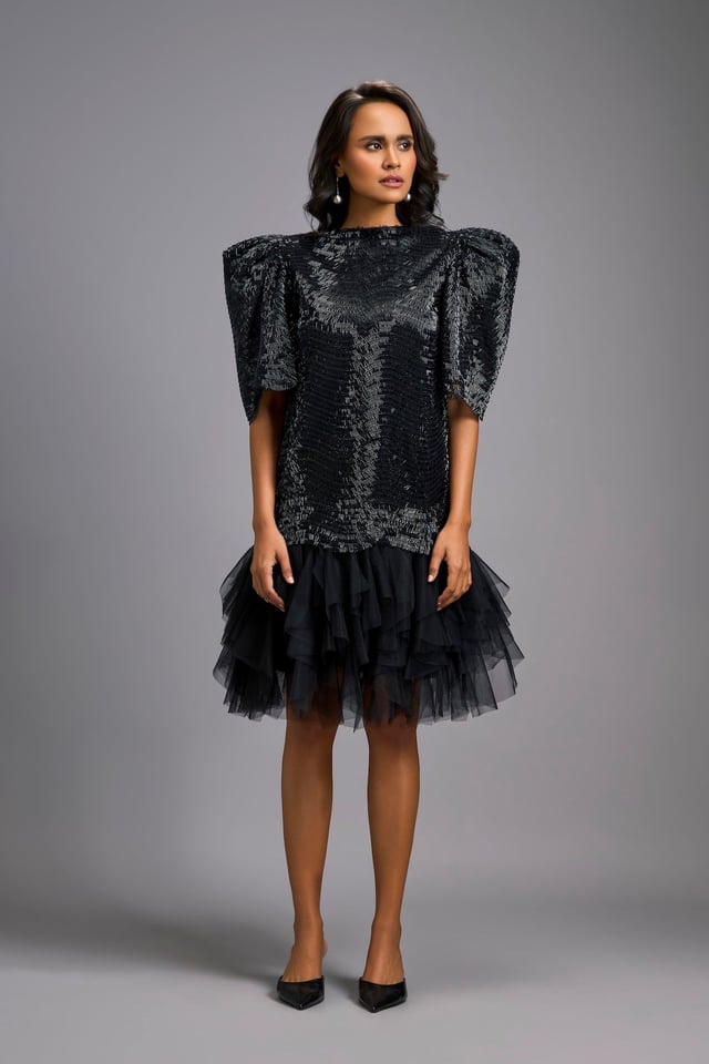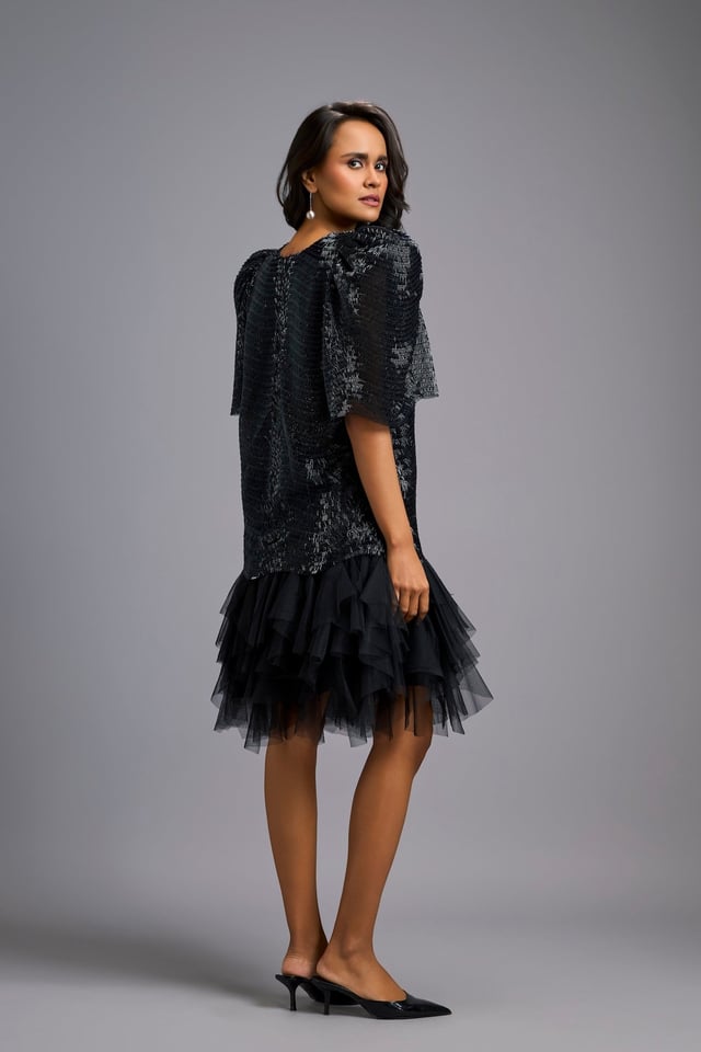 Black Shimmer Dress with Puff Sleeves & Tulle Hem