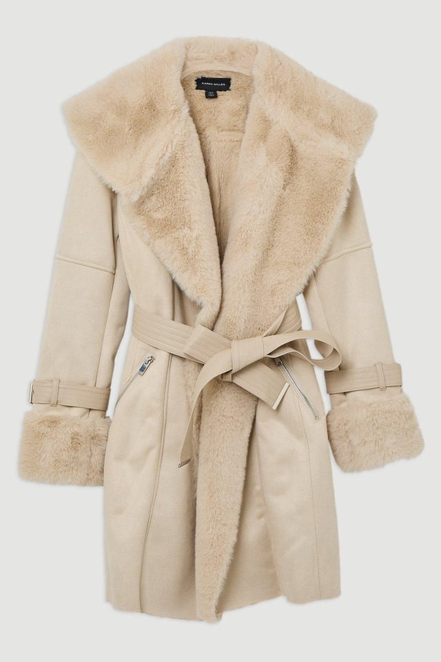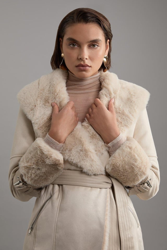 Faux Shearling Collar & Cuff Belted Short Coat