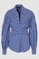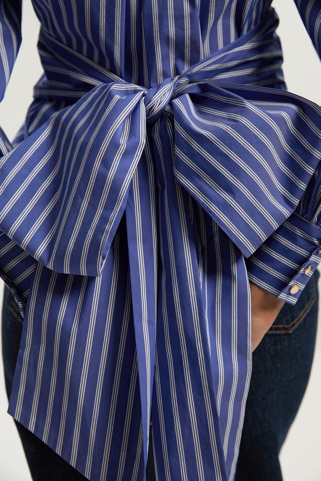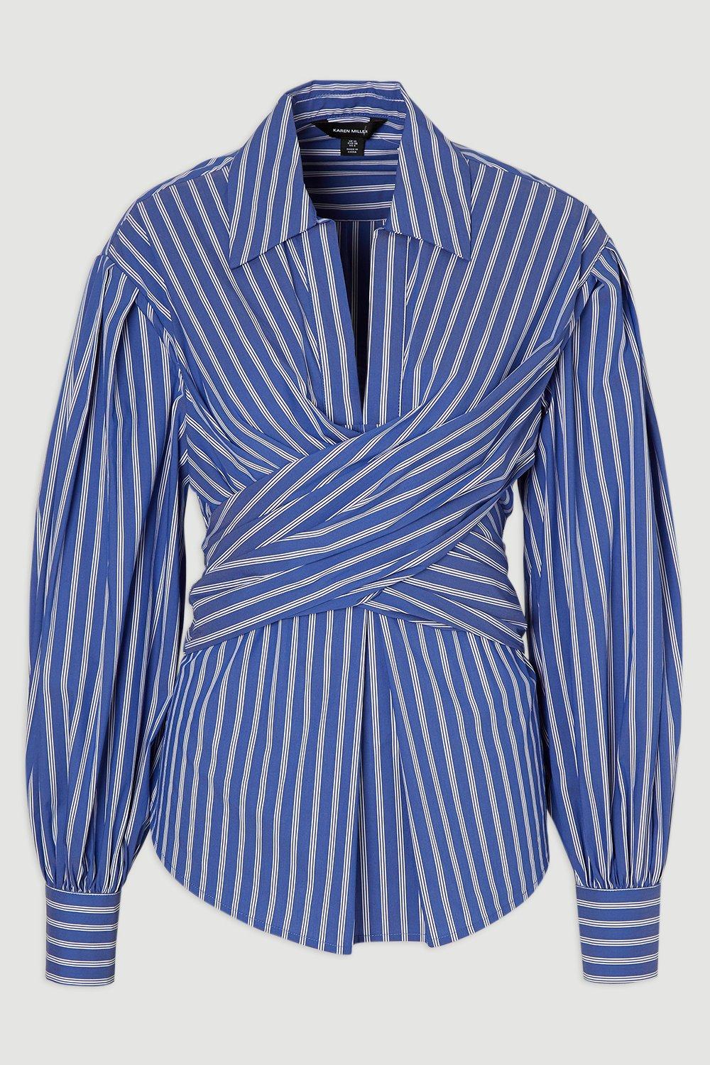 Stripe Cotton Poplin Drama Sleeve Woven Wrap Detail Blouse