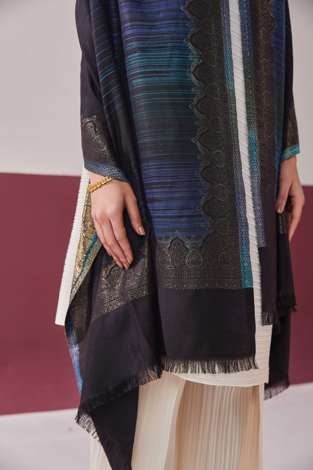 Wool Blue Silk Zari Stole