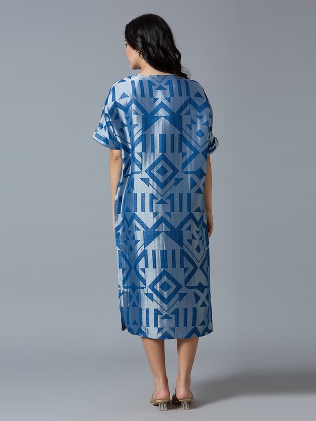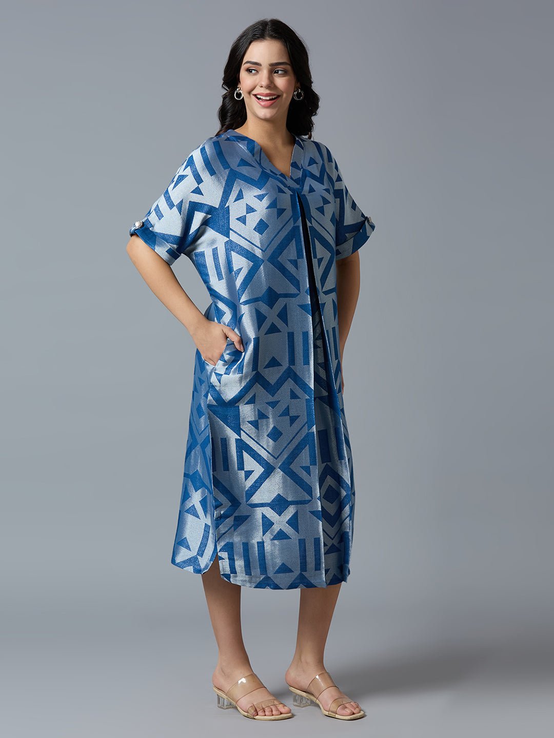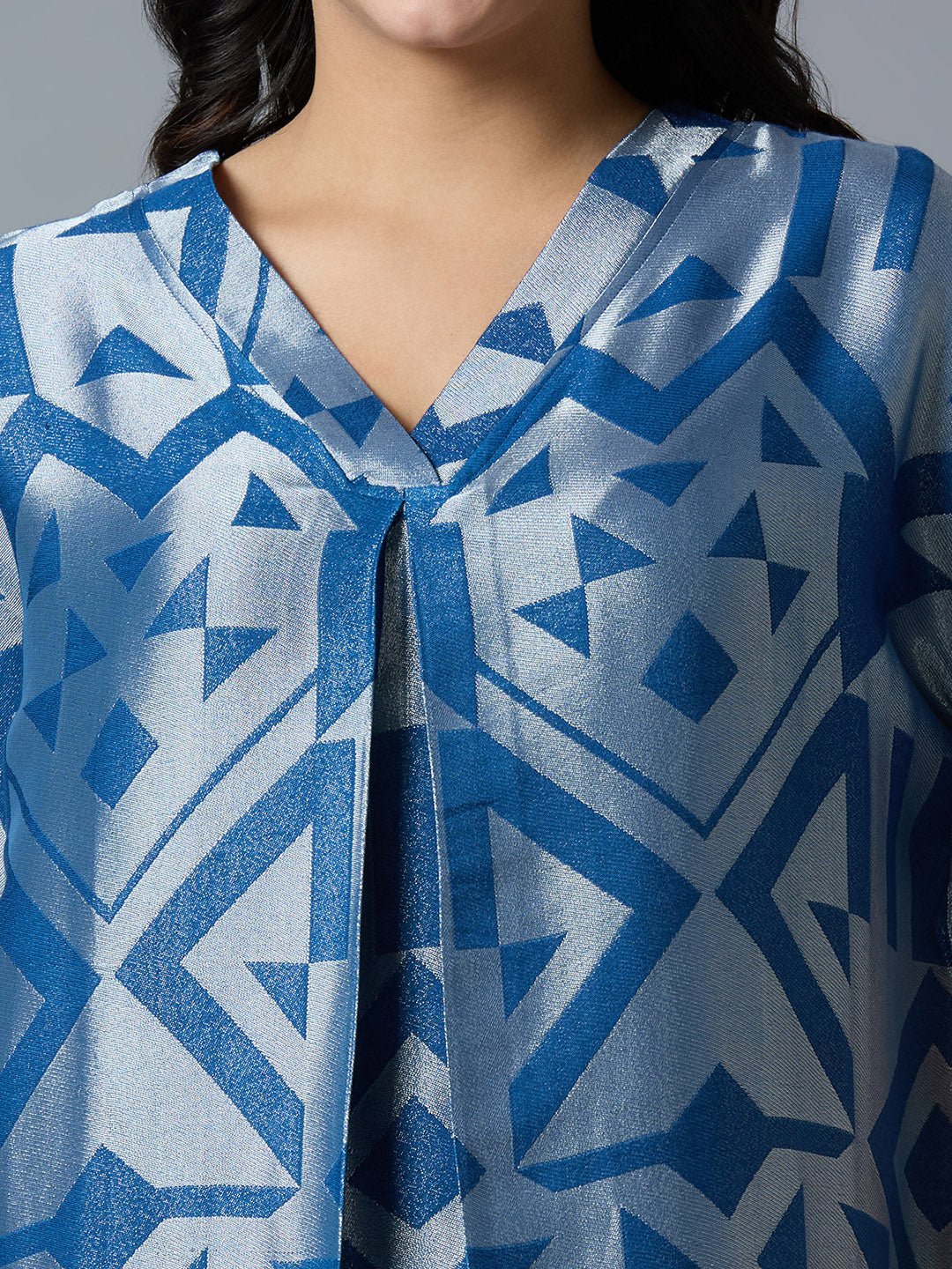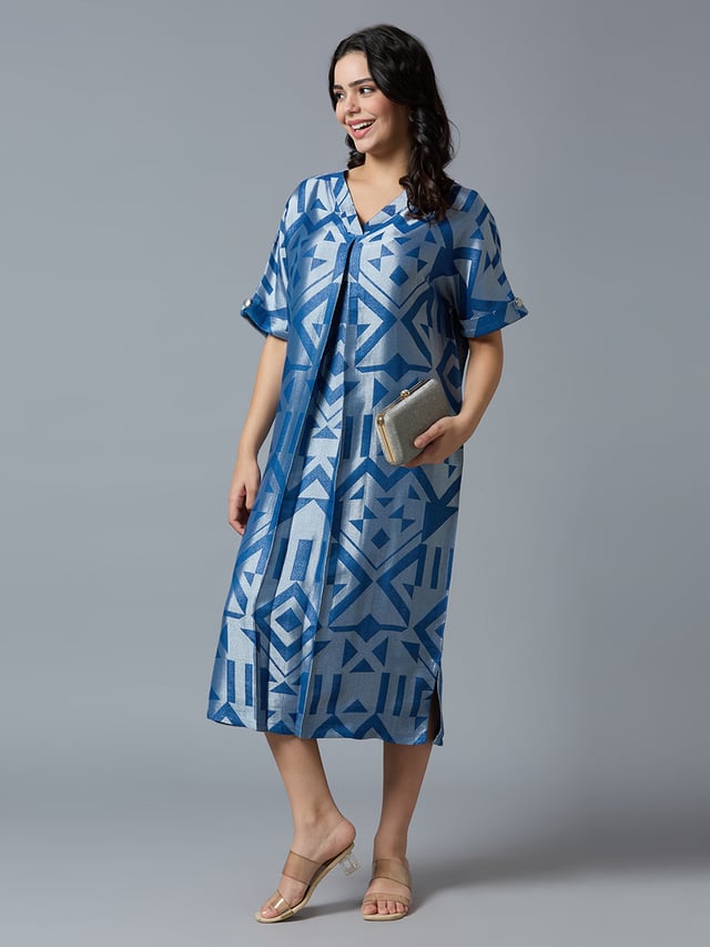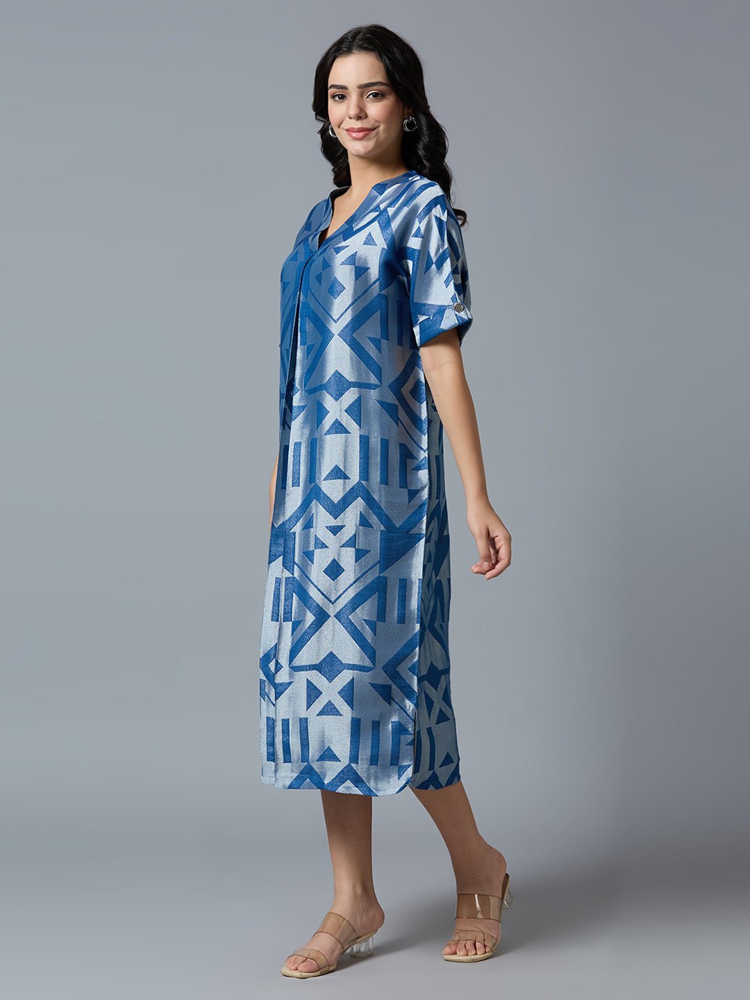 Denim Blue Silver Geometric Brocade Tunic Dress