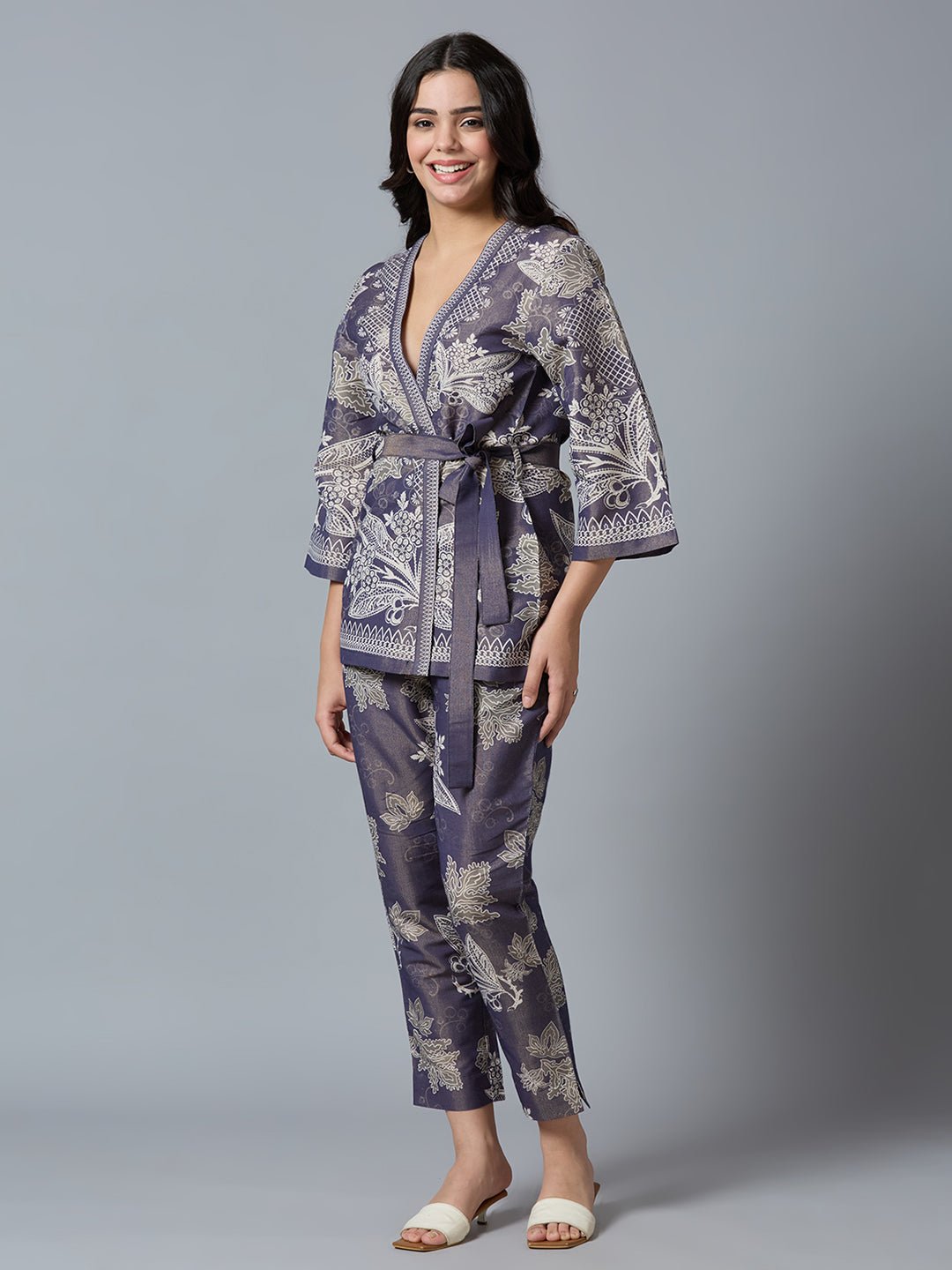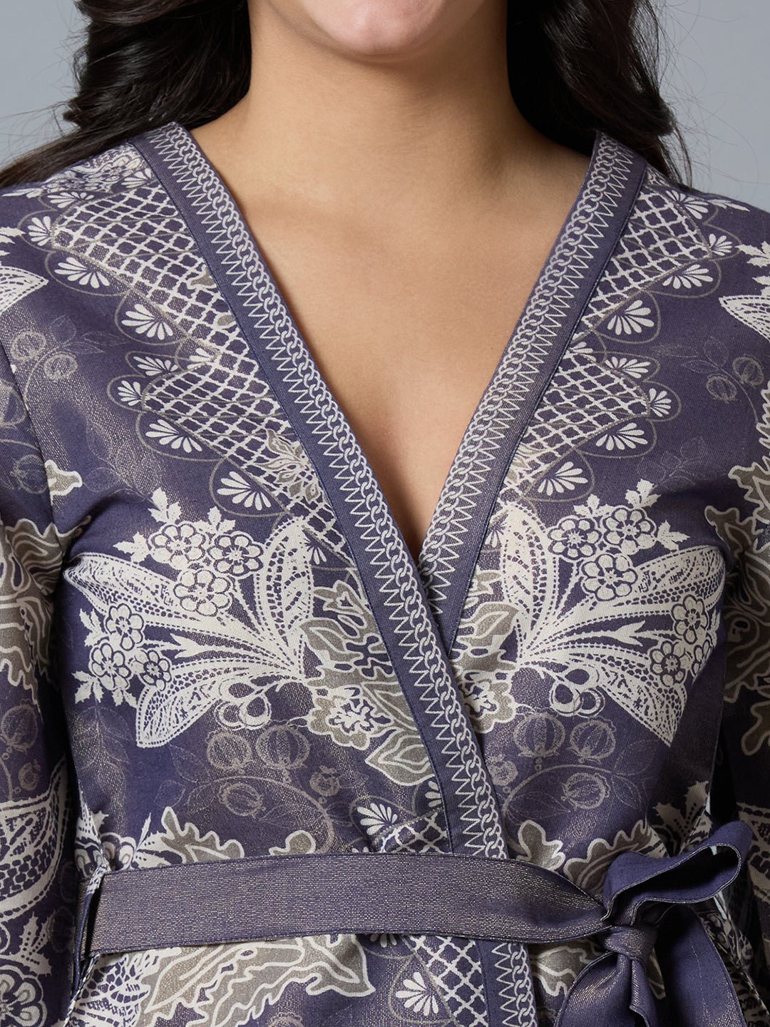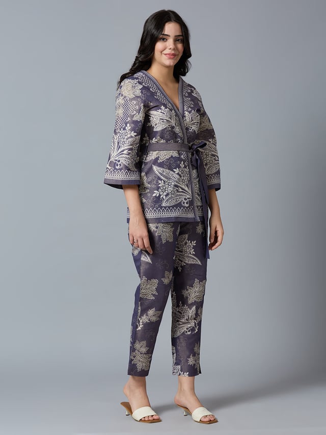 Navy Gold Floral Lacy Printed Metallic Kimono