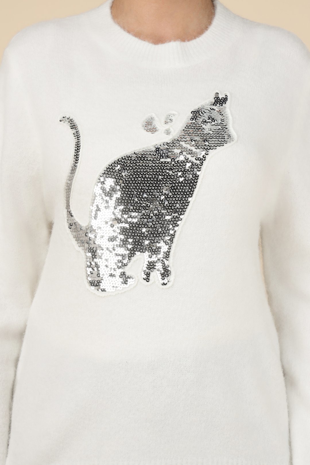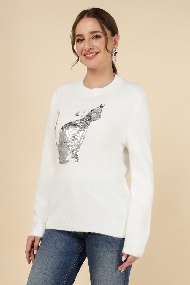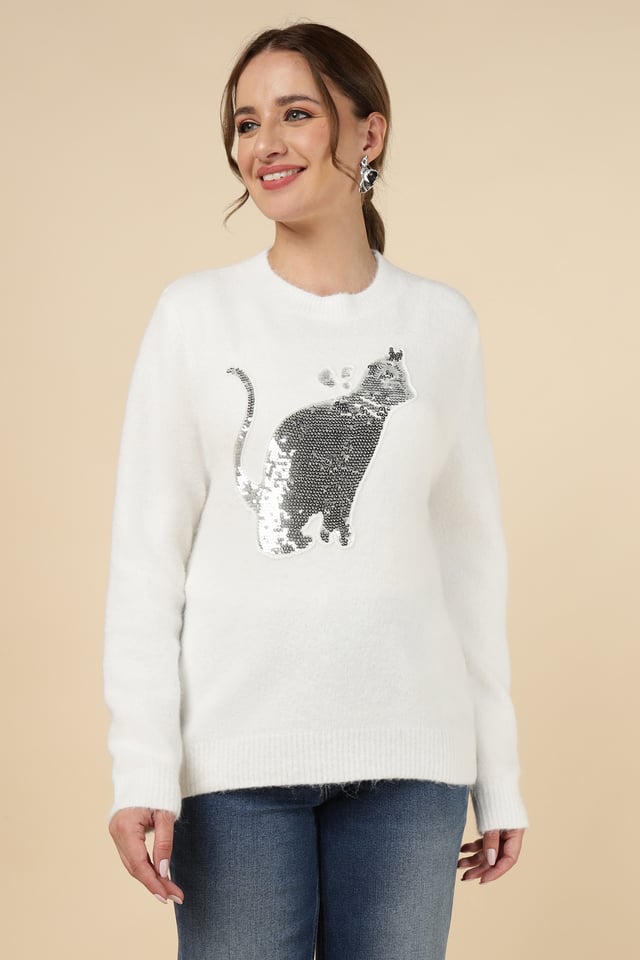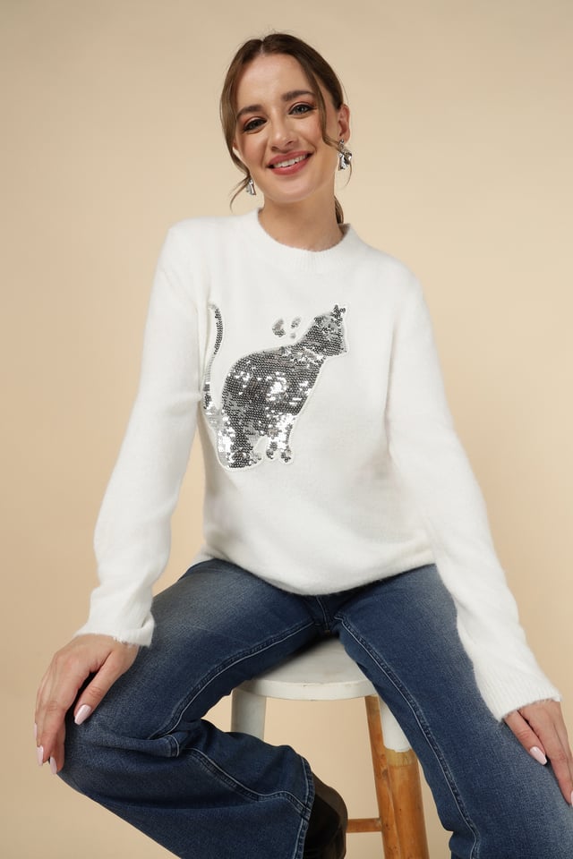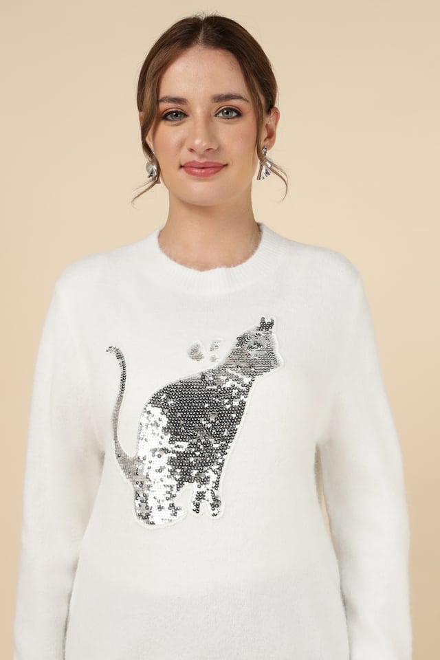 Sequin Cat Motif Sweater