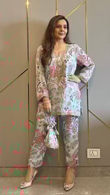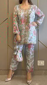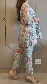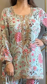 Powder Blue Paisley Phiran Coord with Pants and Matching Potli