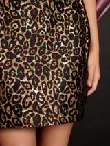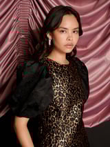 Brown Leopard Jacquard Mini Dress with Black Puff Sleeves