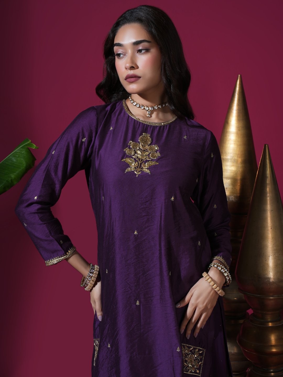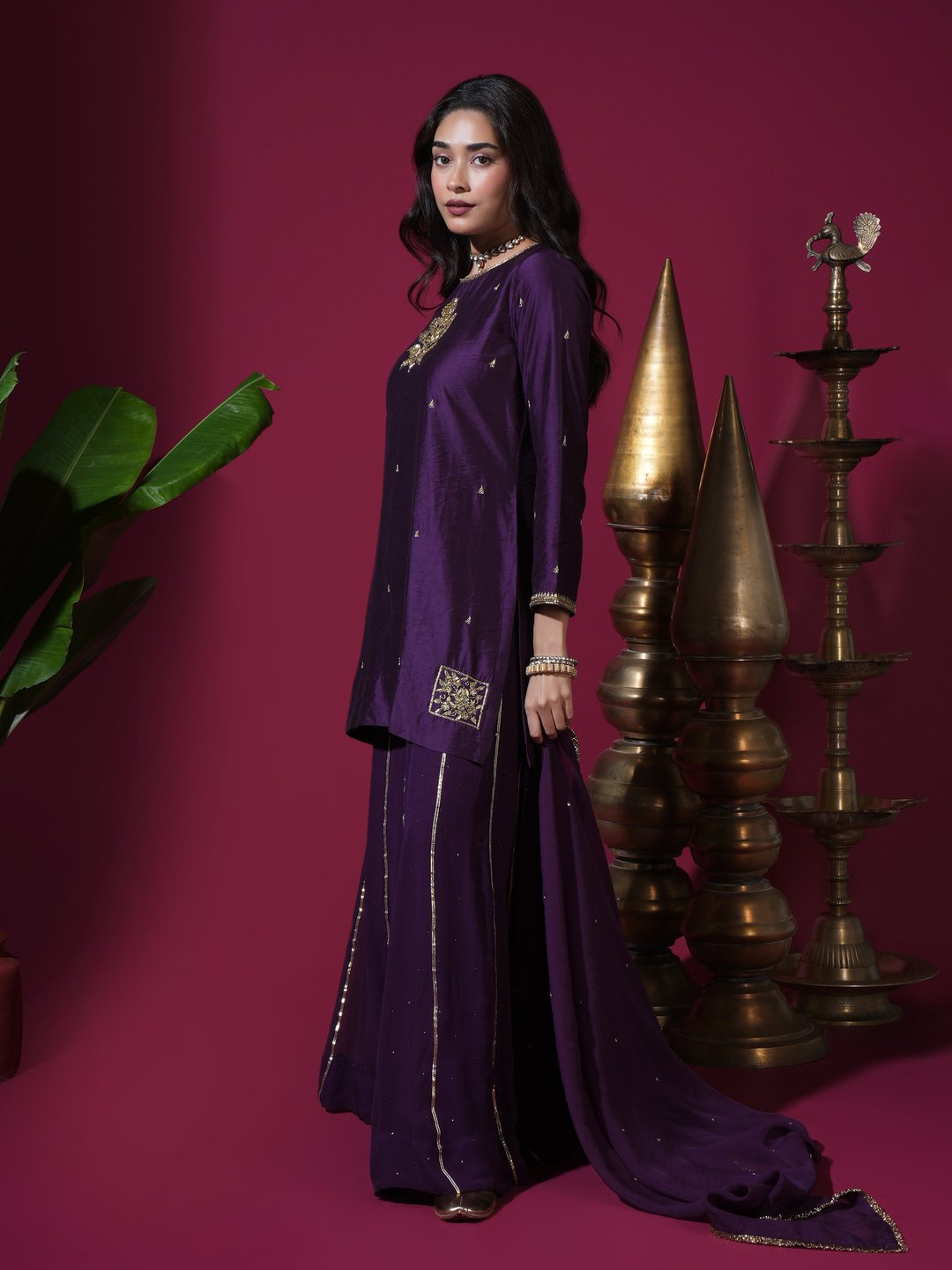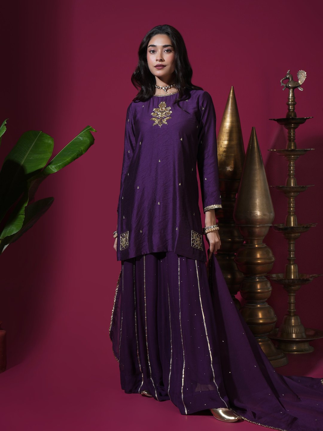 Deep Purple Flower Short Kurta Badla Palazzo Set