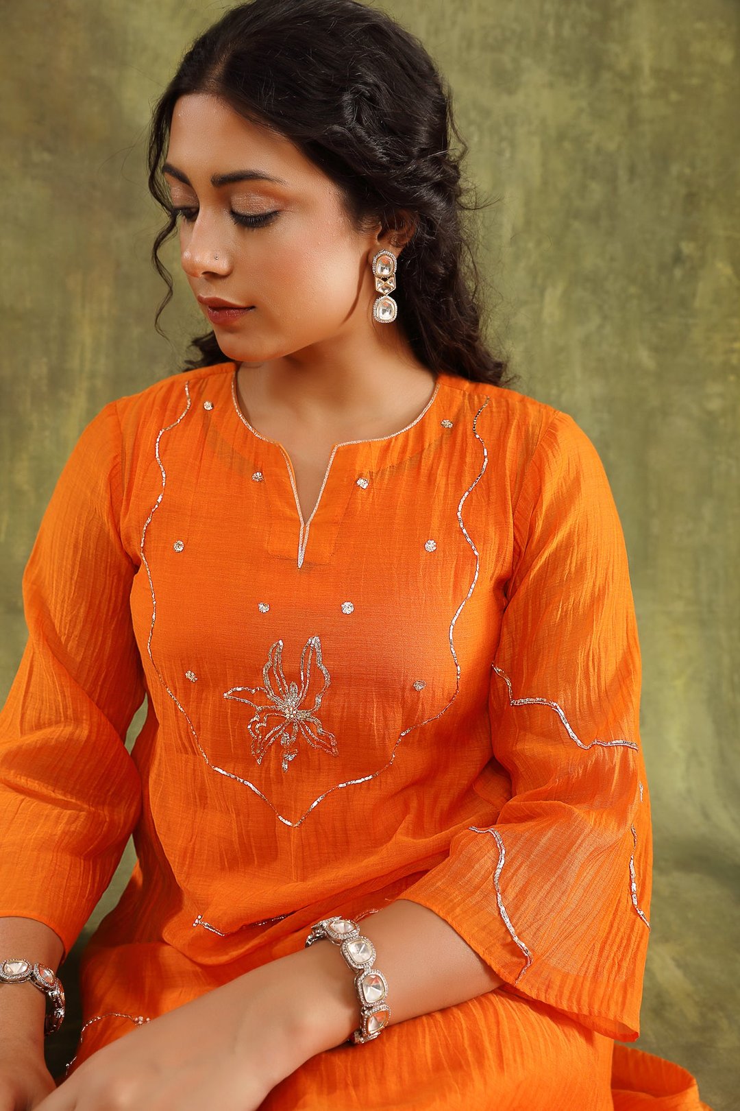 Orange Pitta Embroidered Silk Chanderi Suit Set