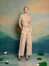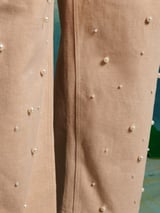 Tan Pearl-Stud High-Waist Wide-Leg Trousers