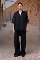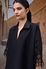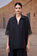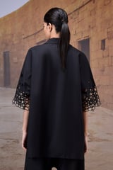 Black Poplin Shirt with Embroidered Cut-Out Sleeves