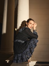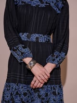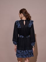 Black Fit and Flare Mini Dress with Blue Floral Embroidery