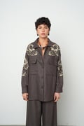 Embellished Brown Shirt with Floral Beadwork and Utility Pockets