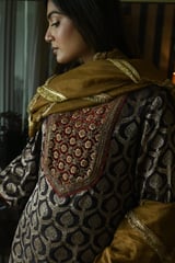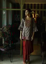 Shruti Kurta Brown Brocade With Red Cowl Skirt