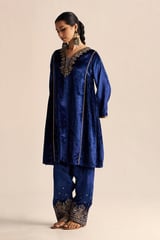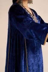 Blue Velvet A-Line Kurta Set with Zari Embroidery