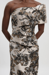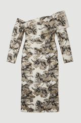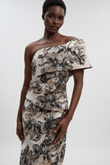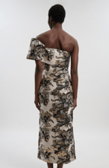 Ivory Floral One-Shoulder Midi Dress with Metallic Accents