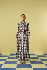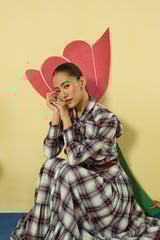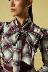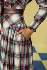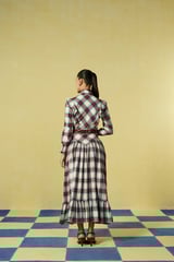 Mauve and White Checked Tie-Neck Tiered Maxi Dress