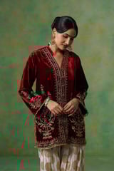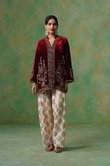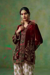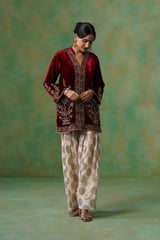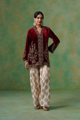 Cherry Red Velvet Embroidered Kurta and Salwar Co-ord Set