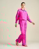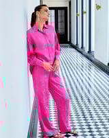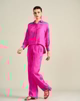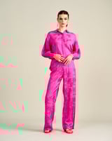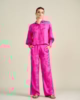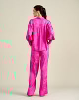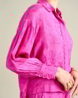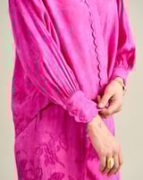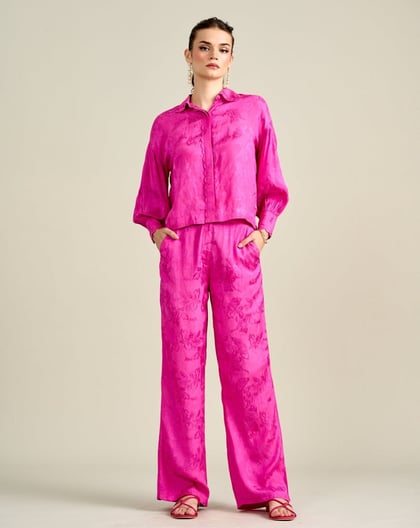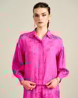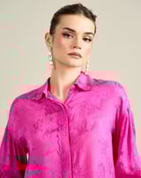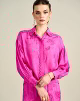Pink Floral Jacquard Button-Down Shirt with Bishop Sleeves