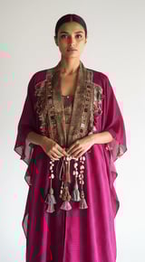 Wine Embellished Cape Co-ord Set with Bustier and Maxi Skirt
