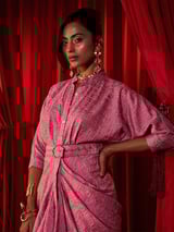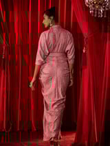 Pink Textured Satin Ruched Maxi Dress with Mandarin Collar