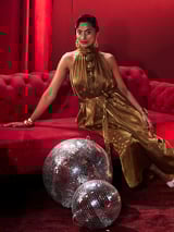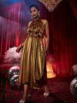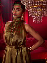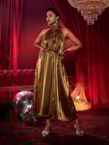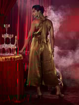 Antique Gold Metallic Halter Jumpsuit with Rosette Detail
