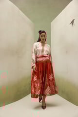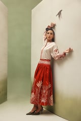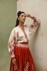 Ivory Cotton Satin Printed Top with Boat Neck Keyhole