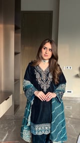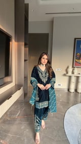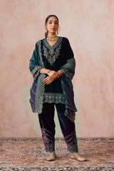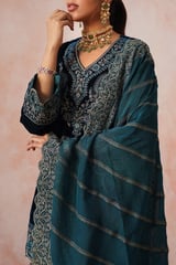 Teal Blue Velvet Embroidered Kurta Set with Organza Dupatta